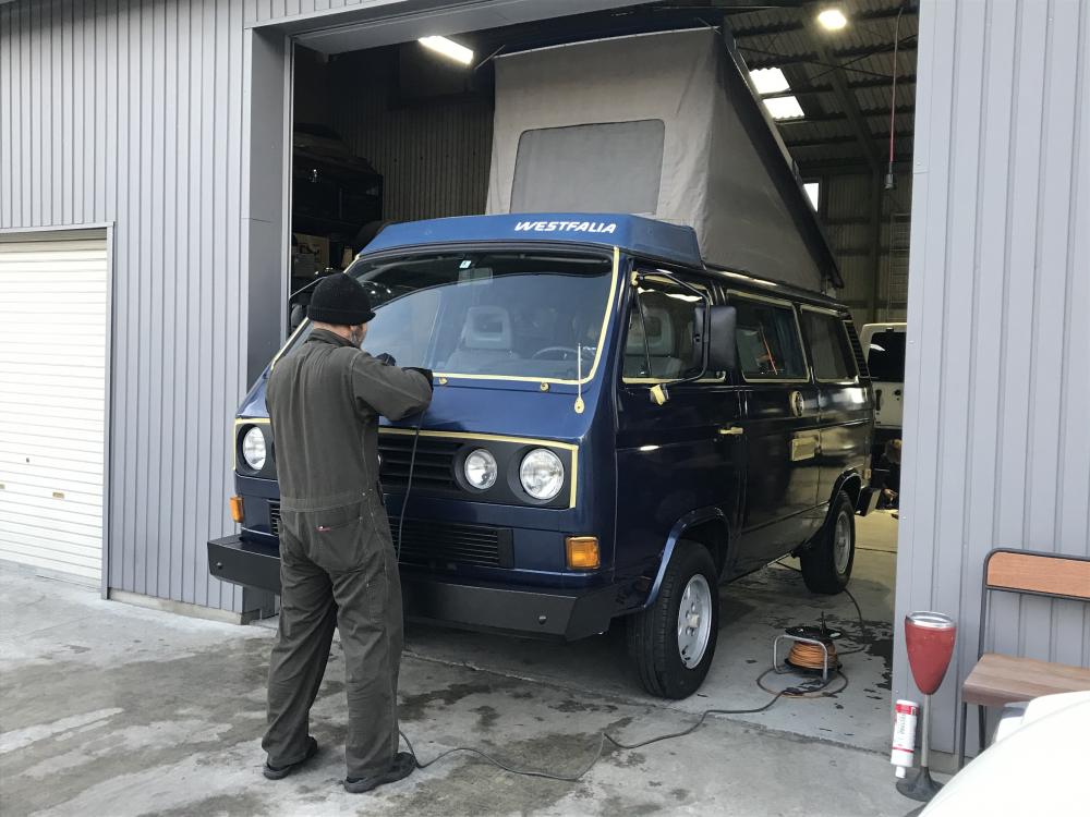 明日納車のヴァナゴンT-3ウェストファリアの仕上げ作業です。